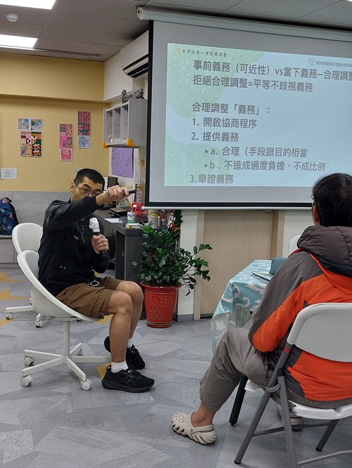 第十場次於 12 月 13 日(六)13:00–17:00 舉行,主題為「尊重差異與公平對話:合理調整的公民審議」。本場次以「合理調整」作為討論議題,邀請具審議民主專長的實務工作者呂家華擔任講師。講座開始前,先由培力成員介紹「合理調整」的概念與相關法律規範,並說明國家報告結論性意見書中專家關切的重點,以及目前「合理調整」在實務上所面臨的兩難情境與意見分歧。
