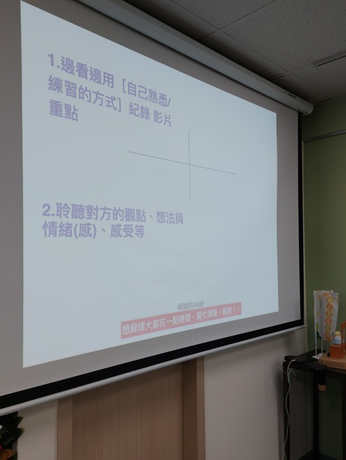 接下來約三小時的課程,透過不同影片作為素材,練習聆聽他人的觀點、想法與情緒感受,同樣是學習理解彼此立場。與 11 月 15 日課程不同的是,本次練習的重點在於「只聽、不評價」:成員需專心聆聽他人所說的內容,完整記錄並轉述對方的觀點,過程中不得加入任何自己的想法、情緒或立場,如同「傳話喝水」般精準。講師發給每位成員一張白紙,並引導摺成四格,代表四個不同層次與面向。成員依序觀看影片,按照步驟完成練習,先以兩人一組進行討論,最後再合併為四人一組,整理出「共同(完全一致)」、「交集(未必一致)」、「分歧(不同想法)」及「其他」四個面向。